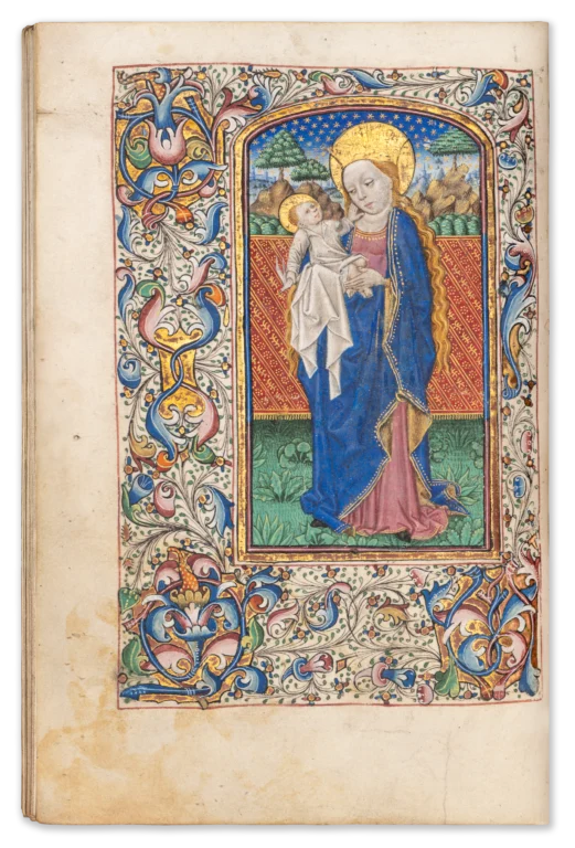 The artist of this book owes much to an illuminator named after his most important work, the Master of the Abingdon Missal. We are only aware of very few of his works, but it is possible that our artist was closely associated with him. Aside from his aesthetic sources, our illuminator reveals an independent spirit in his miniatures. Possibly the most beautiful and ambiguous image in our book is the Madonna with Child on f. 24v. The figure of Mary stands tall and upright in front of an orange brocade cloth of honour that competes with the pinkish red of her tunic. Under her feet a meadow with different herbs grows. In the background a fancy landscape with bizarre rocks and umbrella-like trees stretches under a starry sky. The dignified and monumental posture of the mother, who seems more like a statue is counteracted by the agile and mischievous child. He holds a bird (a dove?) rather recklessly in his right hand, while his left hand touches his mother’s neck.