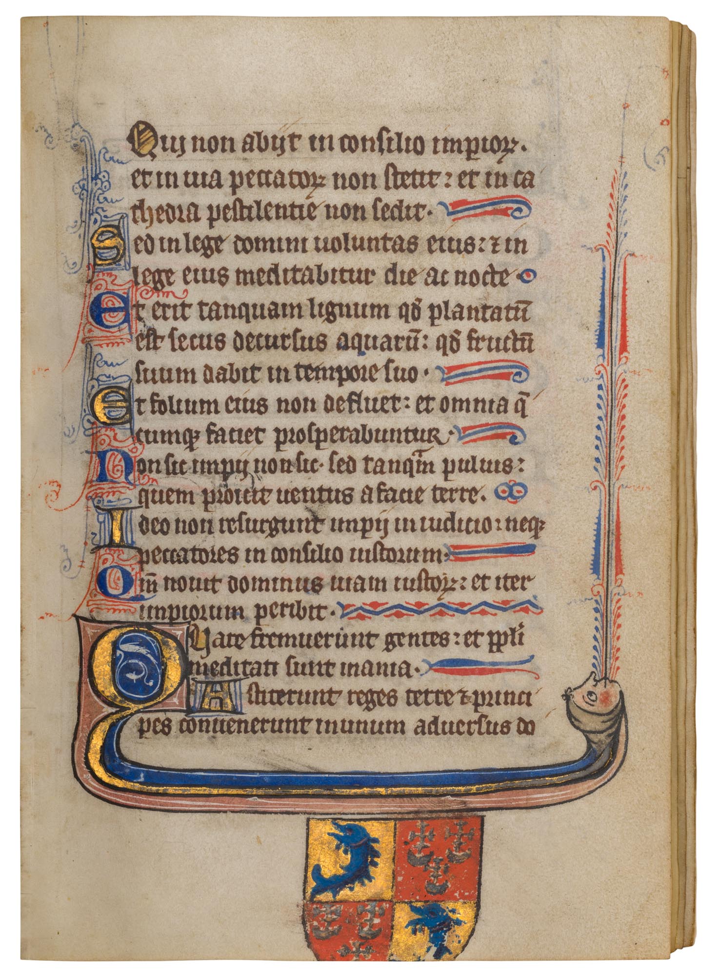 Fig. 14 Franciscan Psalter, use of Ghent. Manuscript in Latin on vellum, possibly illuminated in the workshop of the Franciscan Master of Bruges. Flanders, Bruges, c. 1255-1260, f. 13r, 15th-century coat of arms is in the lower margin.
