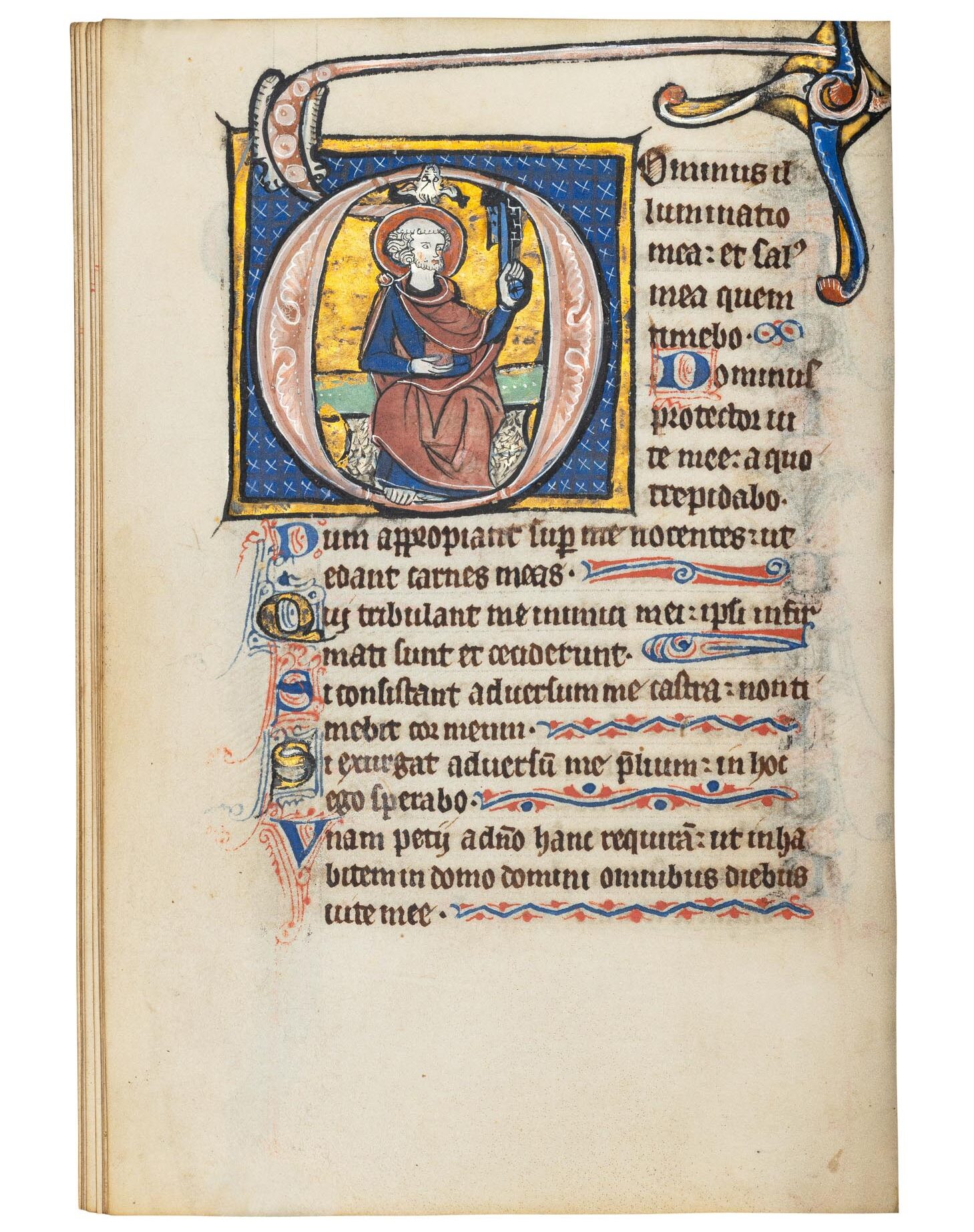 Fig. 10 Franciscan Psalter, use of Ghent. Manuscript in Latin on vellum, possibly illuminated in the workshop of the Franciscan Master of Bruges. Flanders, Bruges, c. 1255-1260, f. 34v, Historiated initial D(ominus illuminatio mea, Ps. 26). The cycle opens with a figure holding a key, who can be identified as Saint Peter.