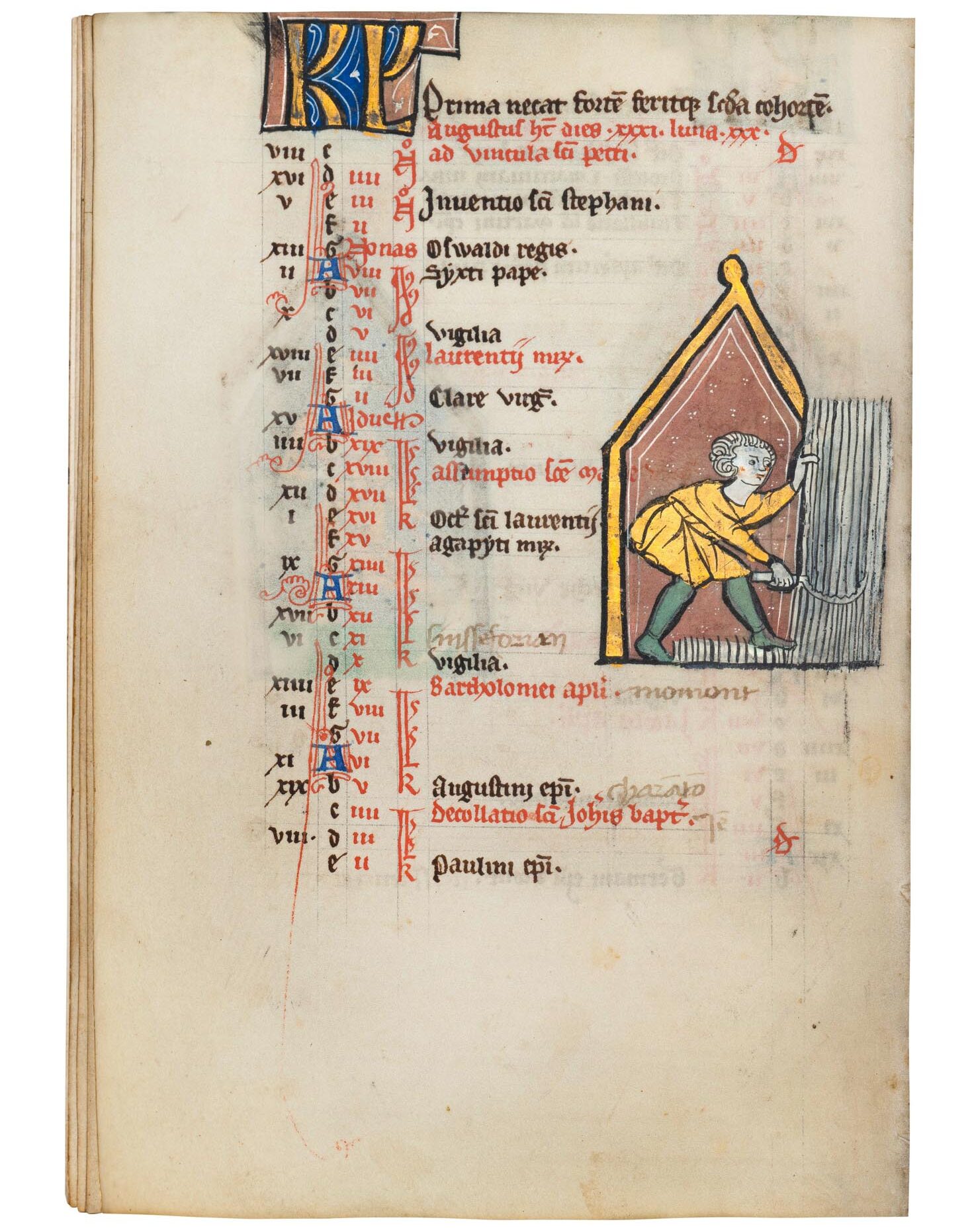 Fig. 1 Franciscan Psalter, use of Ghent. Manuscript in Latin on vellum, possibly illuminated in the workshop of the Franciscan Master of Bruges. Flanders, Bruges, c. 1255-1260, f. 5v, August.
