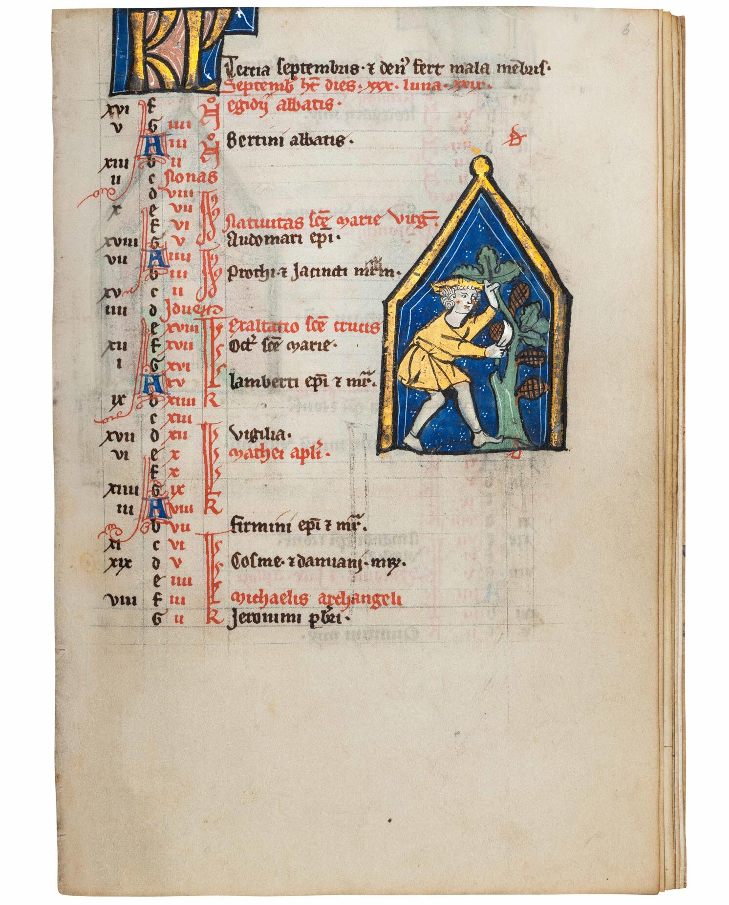 Fig. 2 Franciscan Psalter, use of Ghent. Manuscript in Latin on vellum, possibly illuminated in the workshop of the Franciscan Master of Bruges. Flanders, Bruges, c. 1255-1260, f. 6r, September.