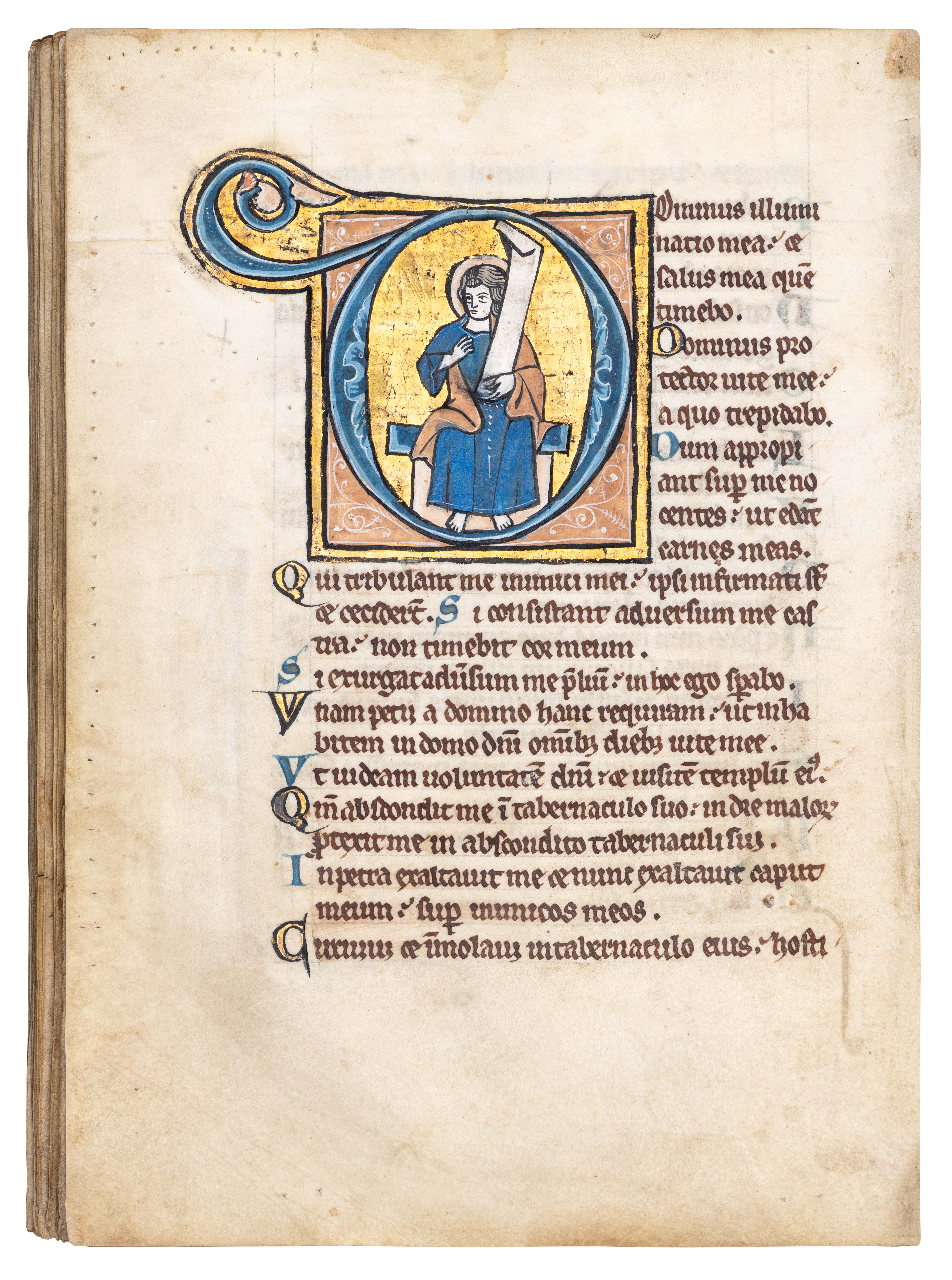 Fig. 9 Psalter. Manuscript in Latin on vellum, illuminated by the Circle of the Franciscan Master. Southern Netherlands, Bruges/Ghent, c. 1255–1265, f. 31v, Historiated Initial D(ominus illuminatio mea Ps. 26): beardless saint. sitting on a bench, holding an empty scroll
