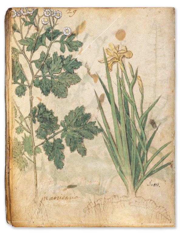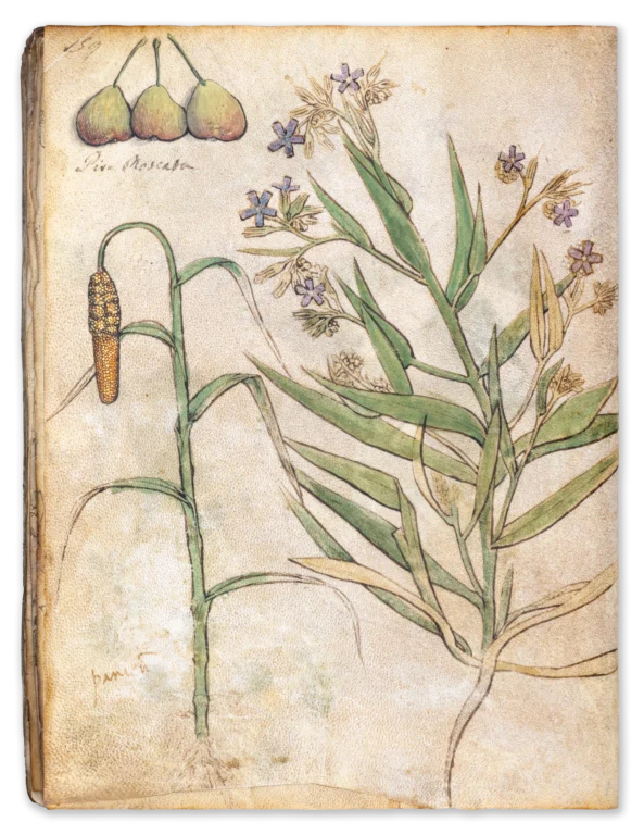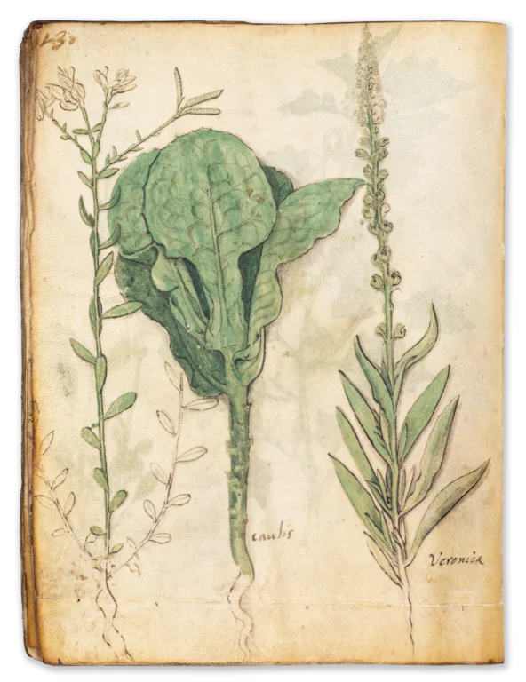 It was most likely produced in northern Italy, probably after 1500, because it already demonstrates a keen interest in botanical accuracy that became the centre of scientific interest in the 16th century. However, our manuscript was obviously not intended to be a book of medical or pharmaceutical instructions. It seems that this volume was intended more as a model book, either for a highly skilled Italian illuminator’s workshop, which used it as a reference work for their projects, or for scientists, who were particularly interested in the details and exact appearance of plants. Compared to other herbals created around the same time in Italy, this work is notable for the stunning precision and authenticity of its illustrations, which are seldom found in comparable works. The book has only been mentioned once in a footnote in an essay by Otto Pächt, as he never studied the manuscript himself. It is therefore an exciting new discovery in the field of medieval botanical manuscripts.