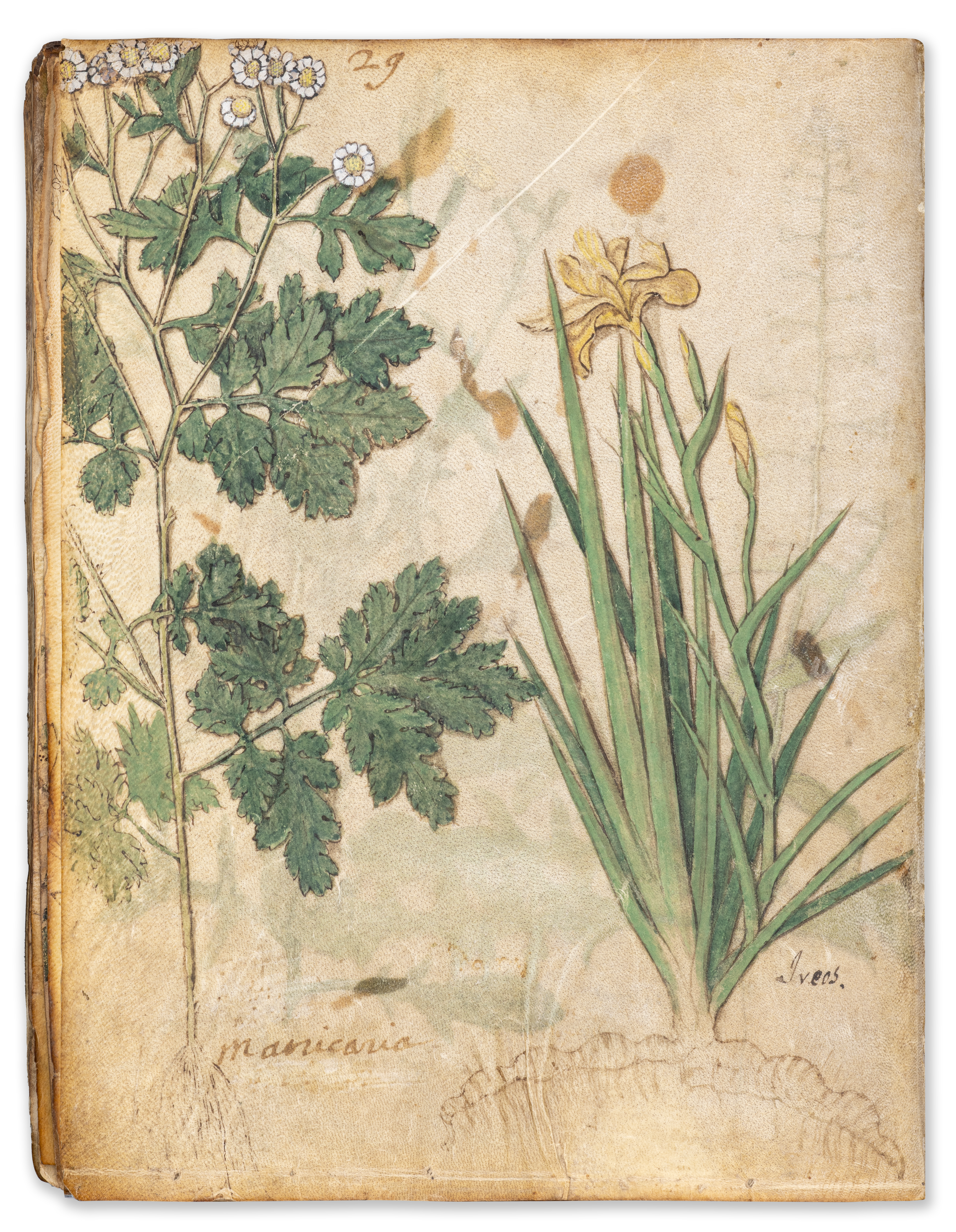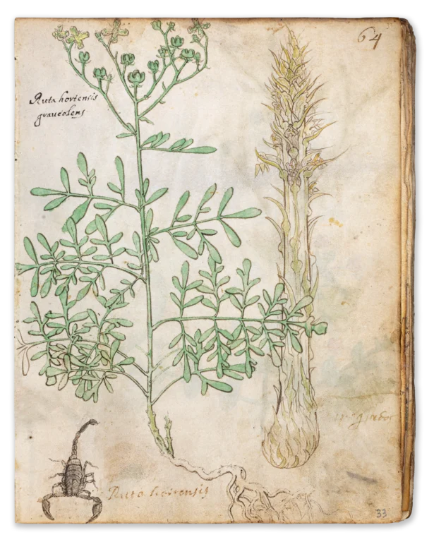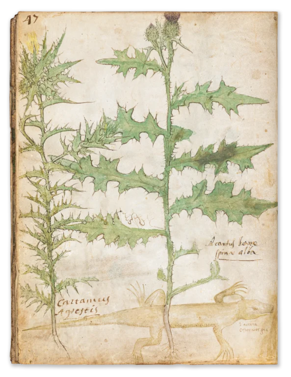91 leaves Almost 400 drawings of plants executed to varying degrees of detail, most with contemporary coloured washes, three drawings of insects (a wasp p. 12; a bee p. 35; a fly p. 51), one large drawing of a lizard (p. 47) and one of a scorpion (p. 64) accompanied by their Latin, Greek or Arabic names in a small, well-formed 15th -century humanistic hand. Good condition.