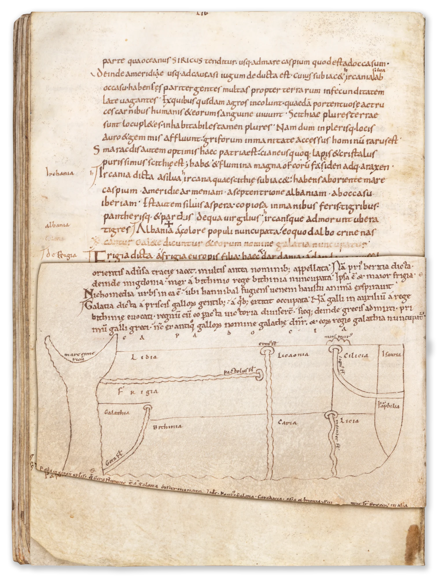 The most extraordinary feature of this manuscript, however, is the inclusion of a map of the regions of Cappadocia on f. 182v. The original campaign had omitted verse 34-38 (of chapter iii, of Book XIV), and when the text was corrected in the 12th century this section was added on a parchment fragment and completed with a map of the region. The map lists the regions of Cappodocia (Lidia, Frigida, Bithinia, Galatheia, Caria, Liconoa, Cilica, Licia, Isauraia, Pamphilla) as well as neighbouring ocean (Cimerian Sea), mountains (Mount Tauraus) and several rivers in the region (Meander and Cignus). At the bottom of the parchment leaf is an extract from Bede on the region: Beda in canonicas epistulas: quae Gera flumine est a Galatia disterminata and idem: Pontus, Galatia, Cappadocia, Asia et Bitinia provintie sunt Grecorum in Asia. Intrguinly, the map includes the river Hiera, which is mentioned by Bede, but not Isidore, and the river Meander, which is not mentioned by either scholar.