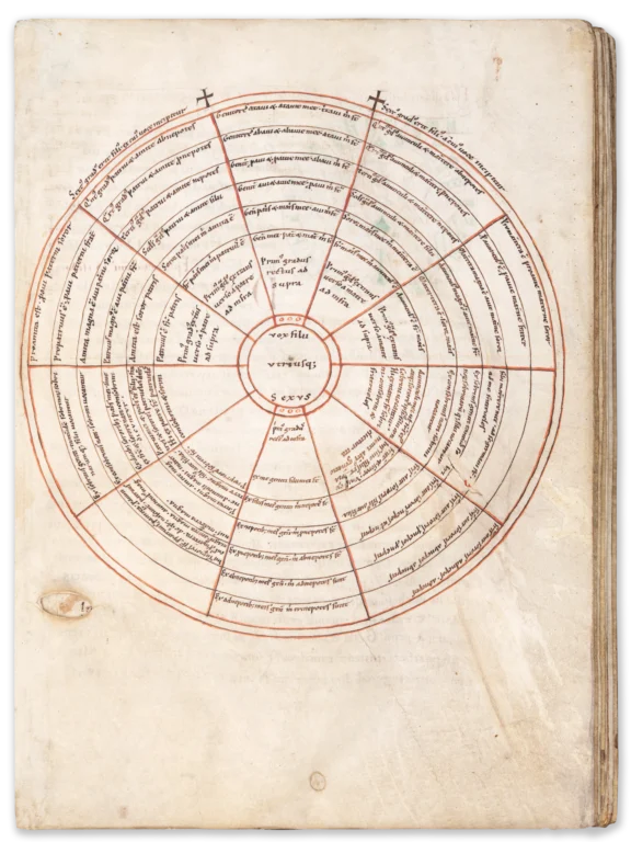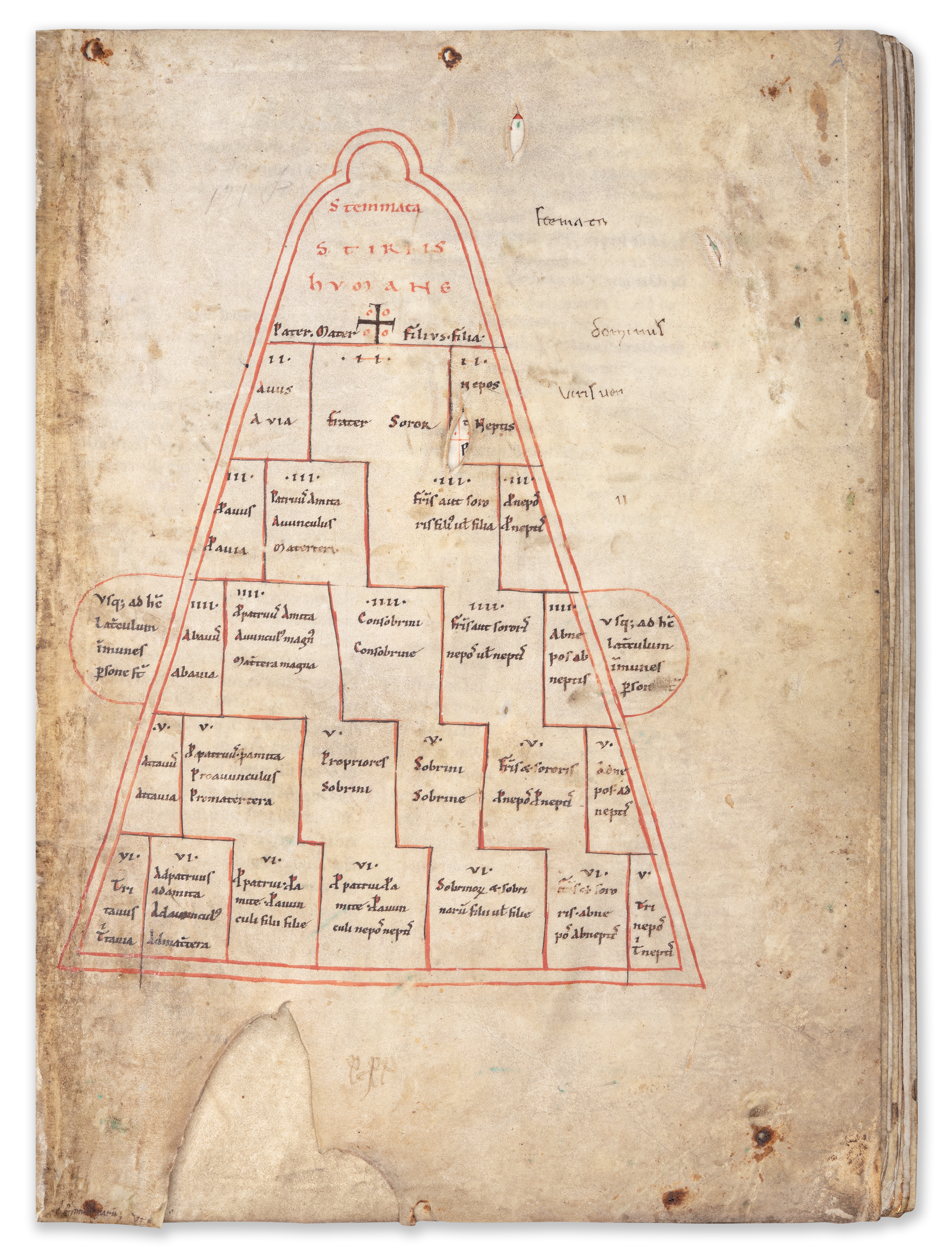 i + 267 + I ff. 1 large zoomorphic initial, 5 pages with small interlinear diagrams, 1 marginal T-O Map, 3 full-page diagrams on human relationships and 1 inserted map of Anatolia (12th century additions). Complete. Rebound in a modern binding after 2018. Very good condition.