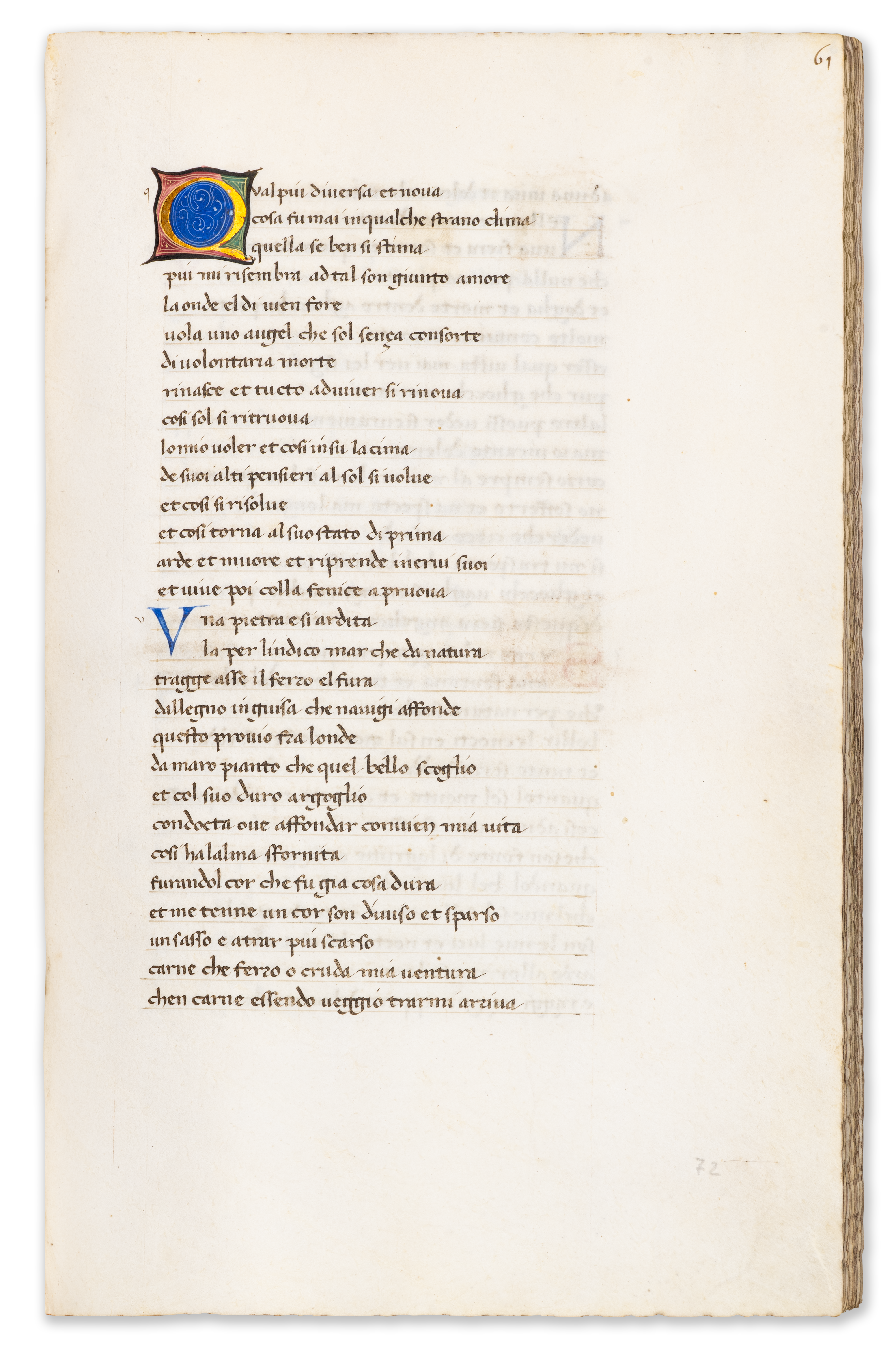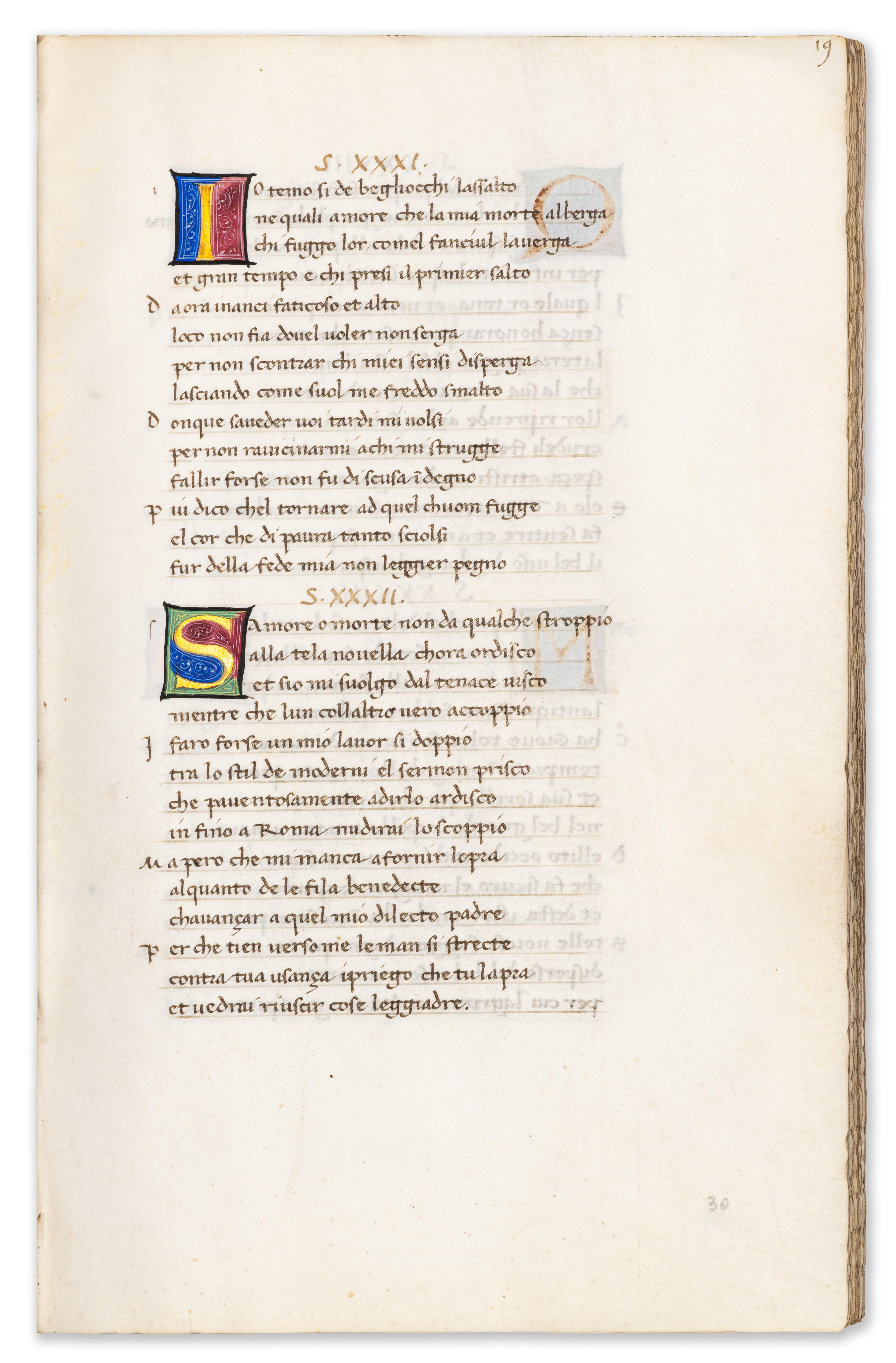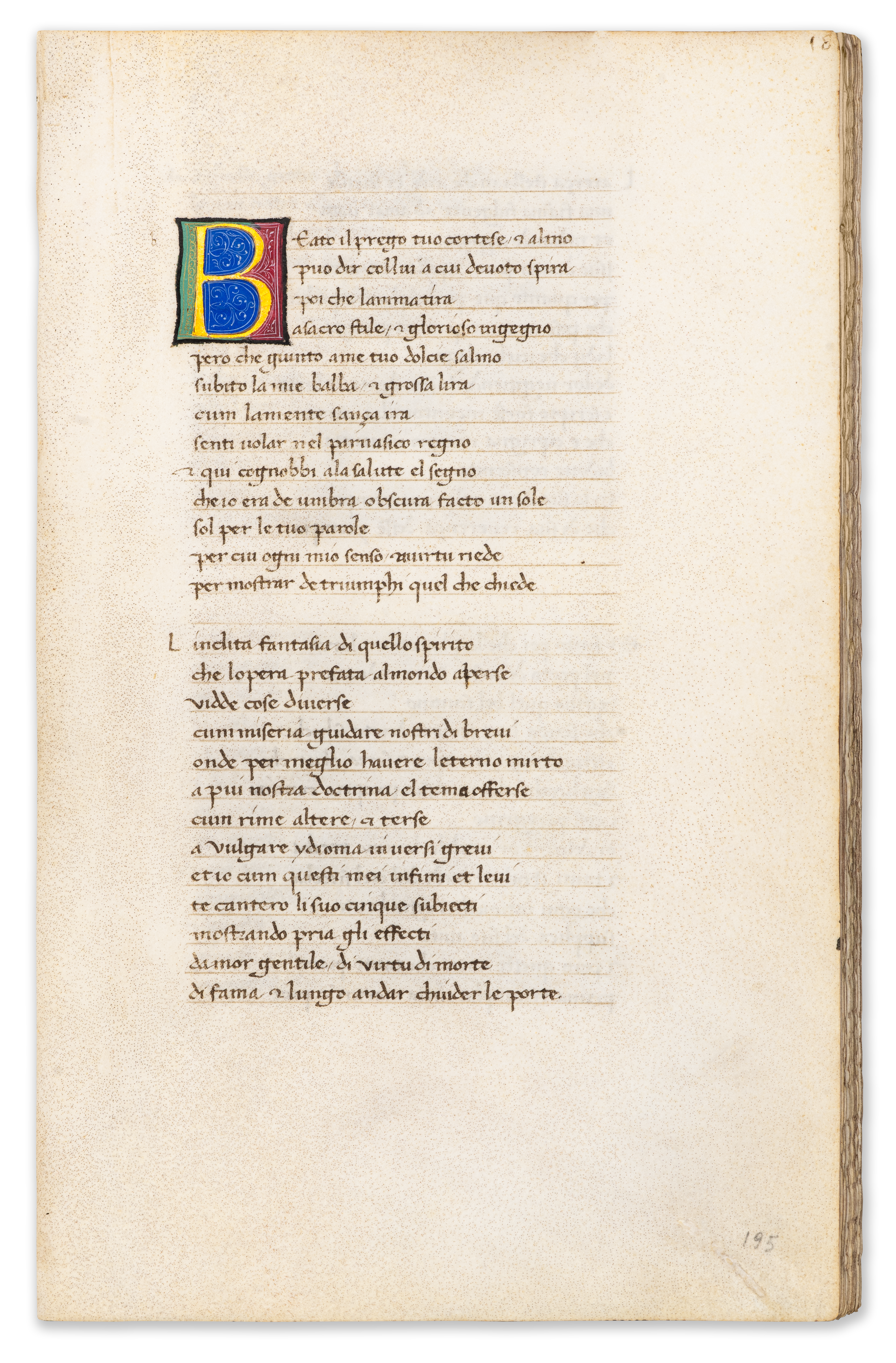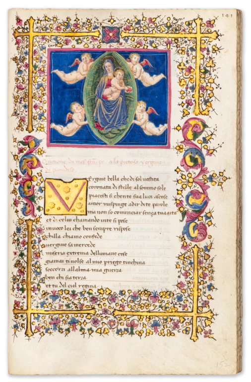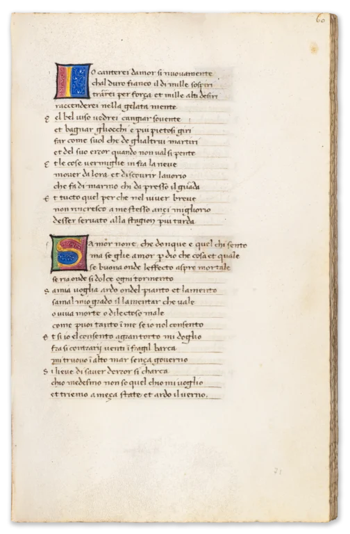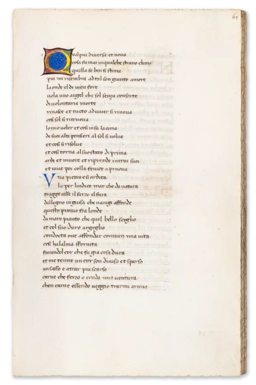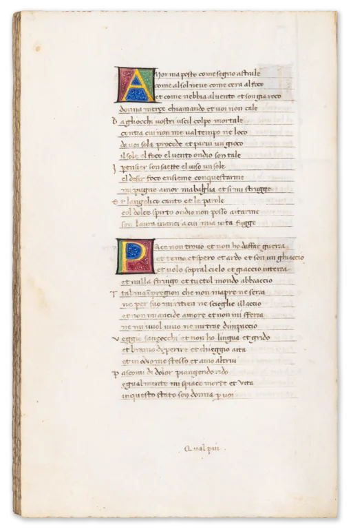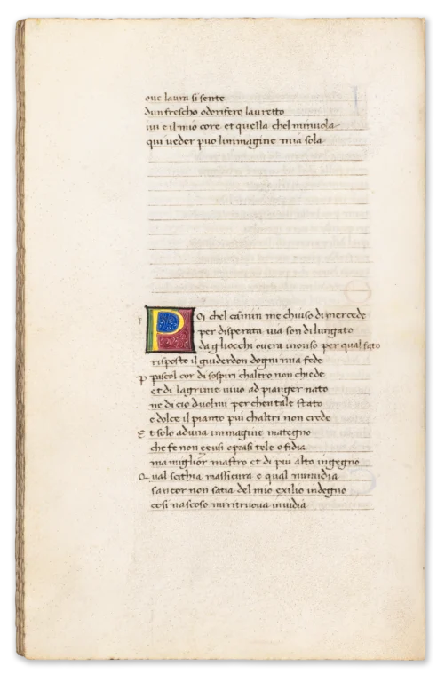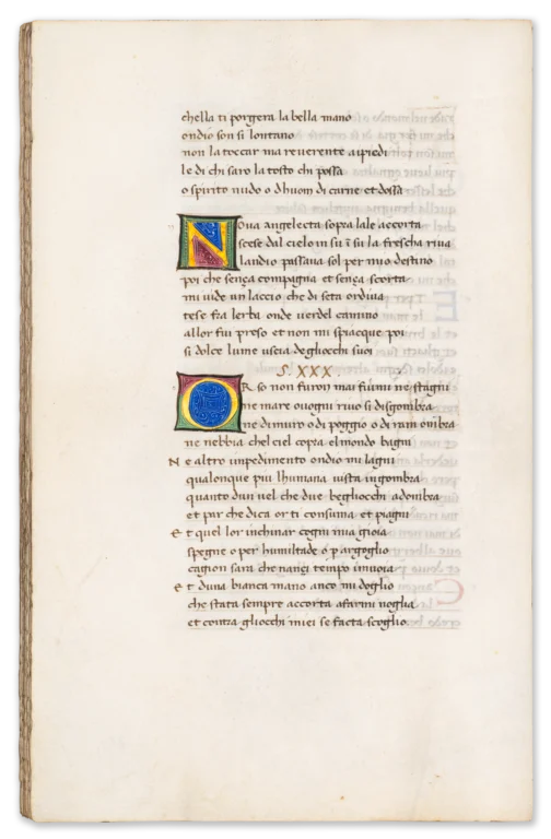 The manuscript also preserves an interesting physical trace of censorship: the so-called “Babylonian sonnets,” critical of the Avignon papacy, were visibly crossed out and the leaves temporarily sealed—an act of expurgation that highlights the ideological tensions surrounding Petrarch’s work. Its distinguished provenance— encompassing Cardinal Gentili, the renowned bibliophile Henry Huth, and the Swiss collector Arnold Mettler—further underlines its stature as a manuscript of exceptional pedigree.