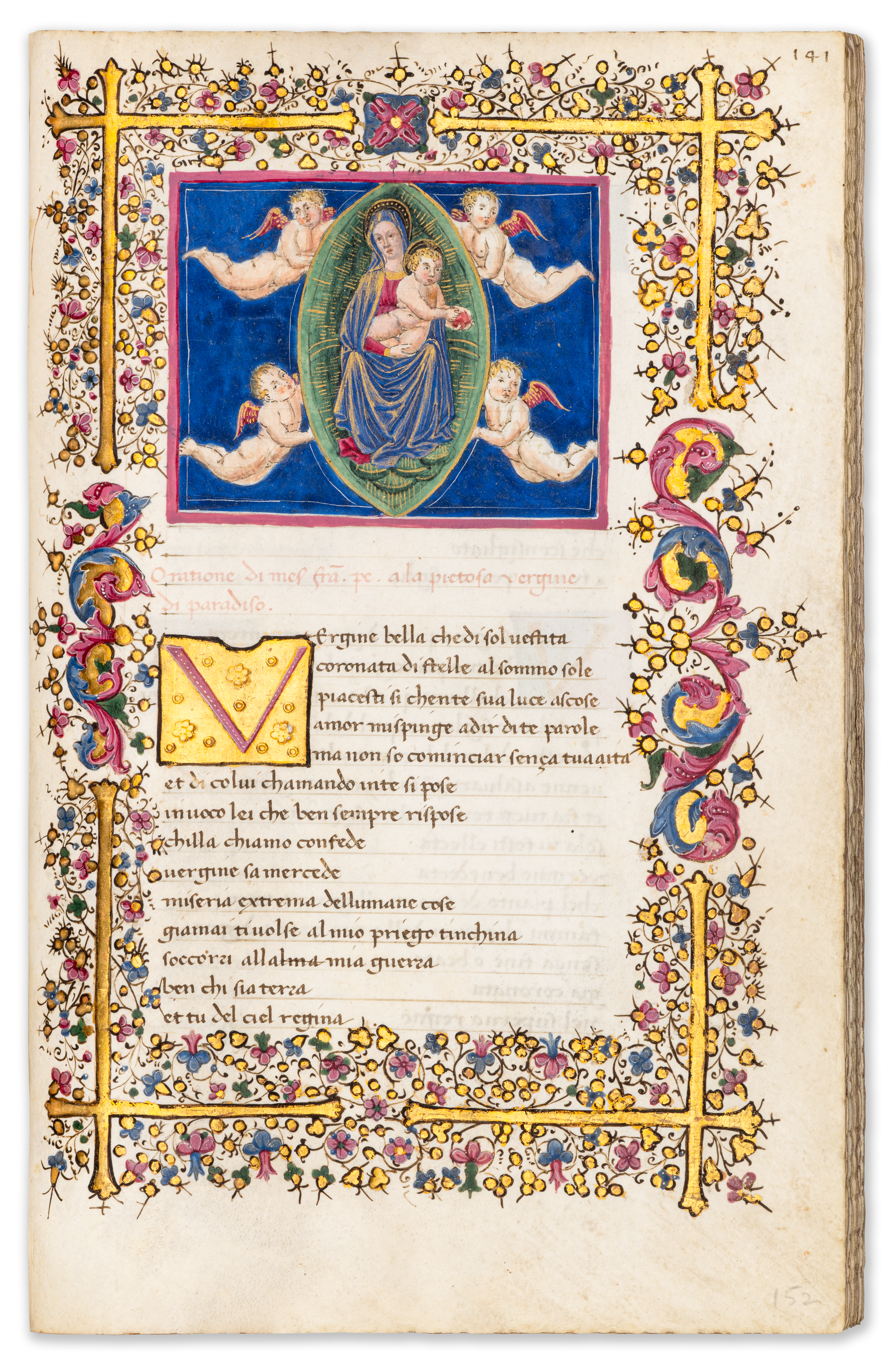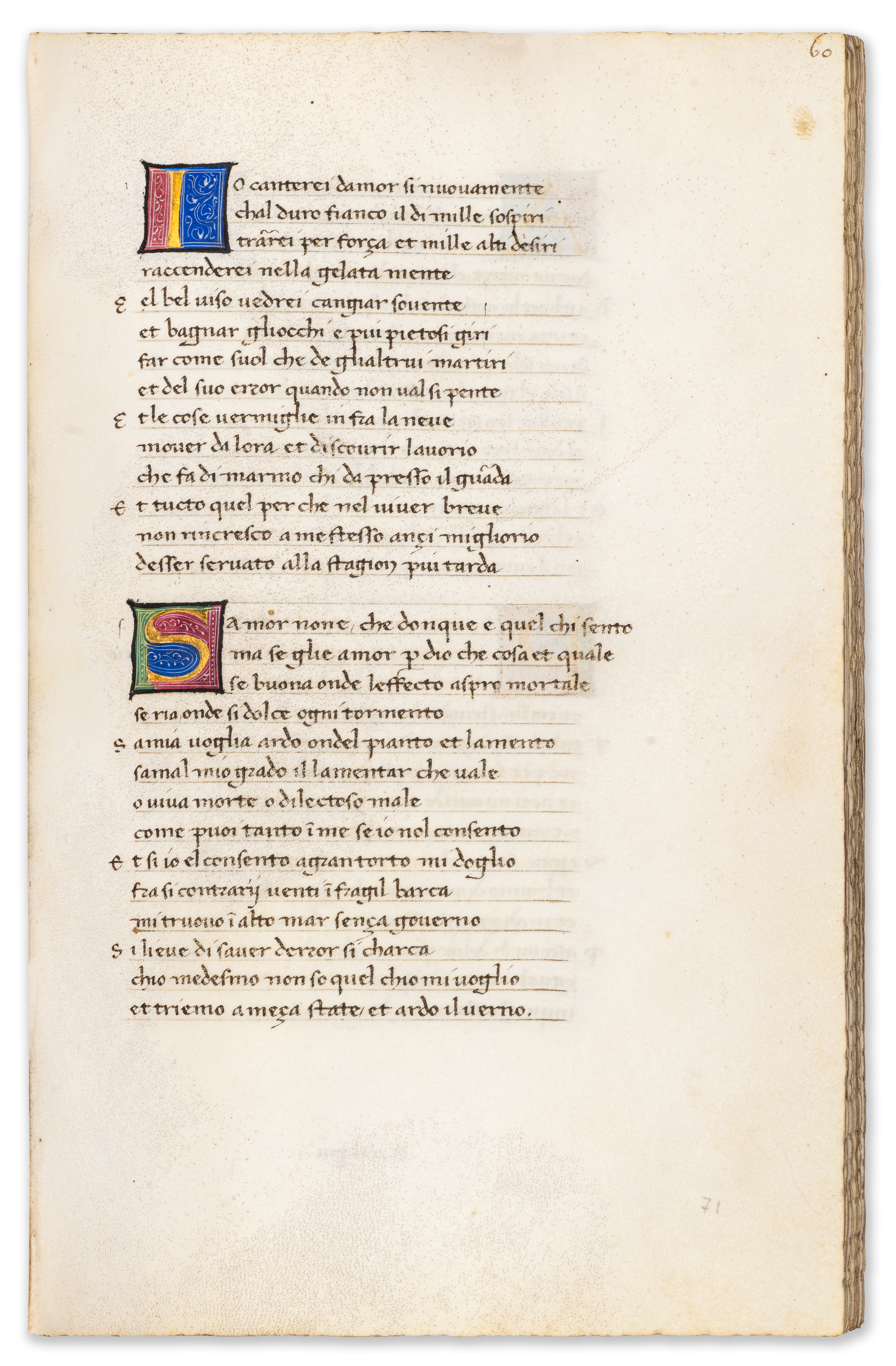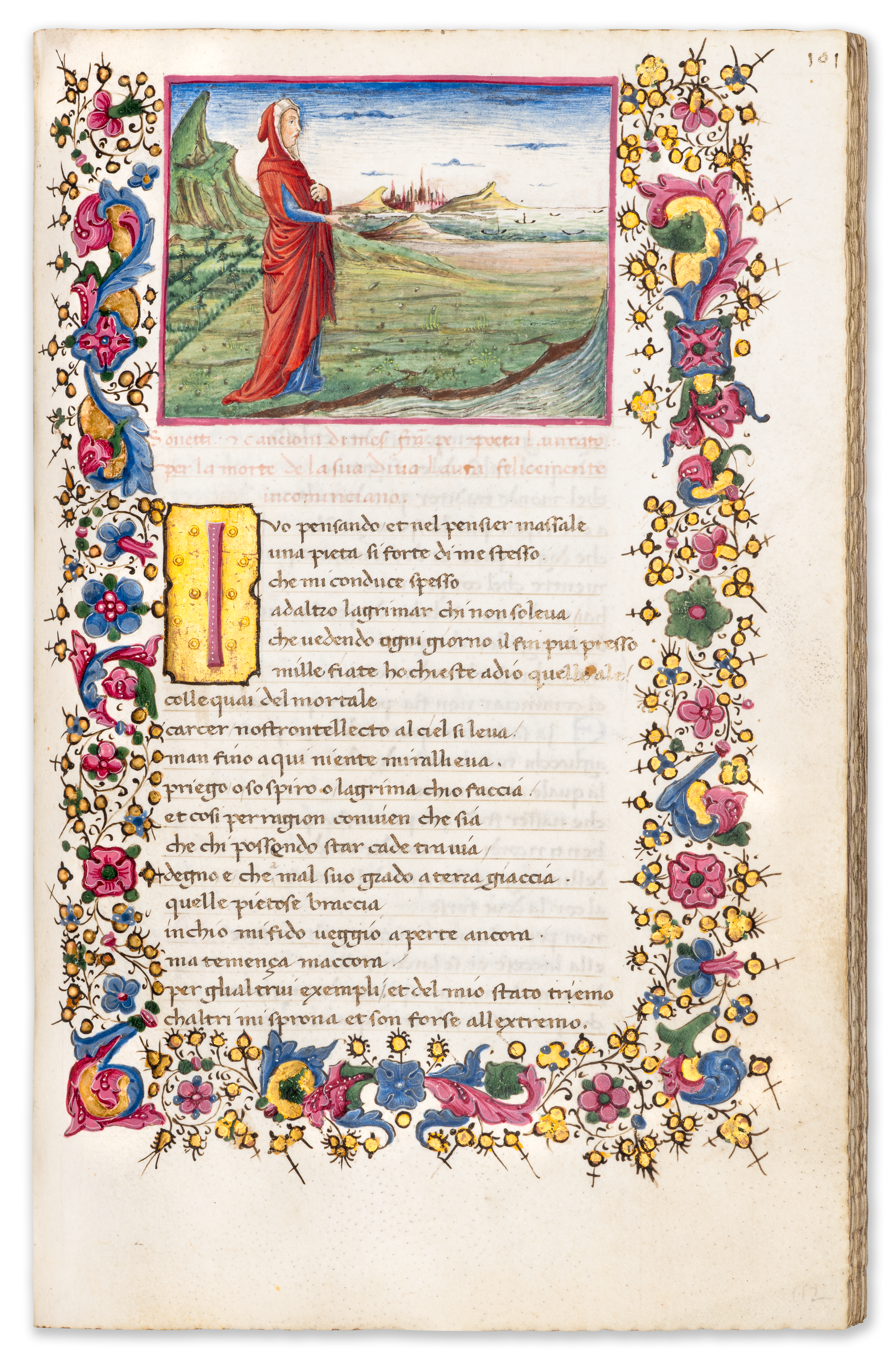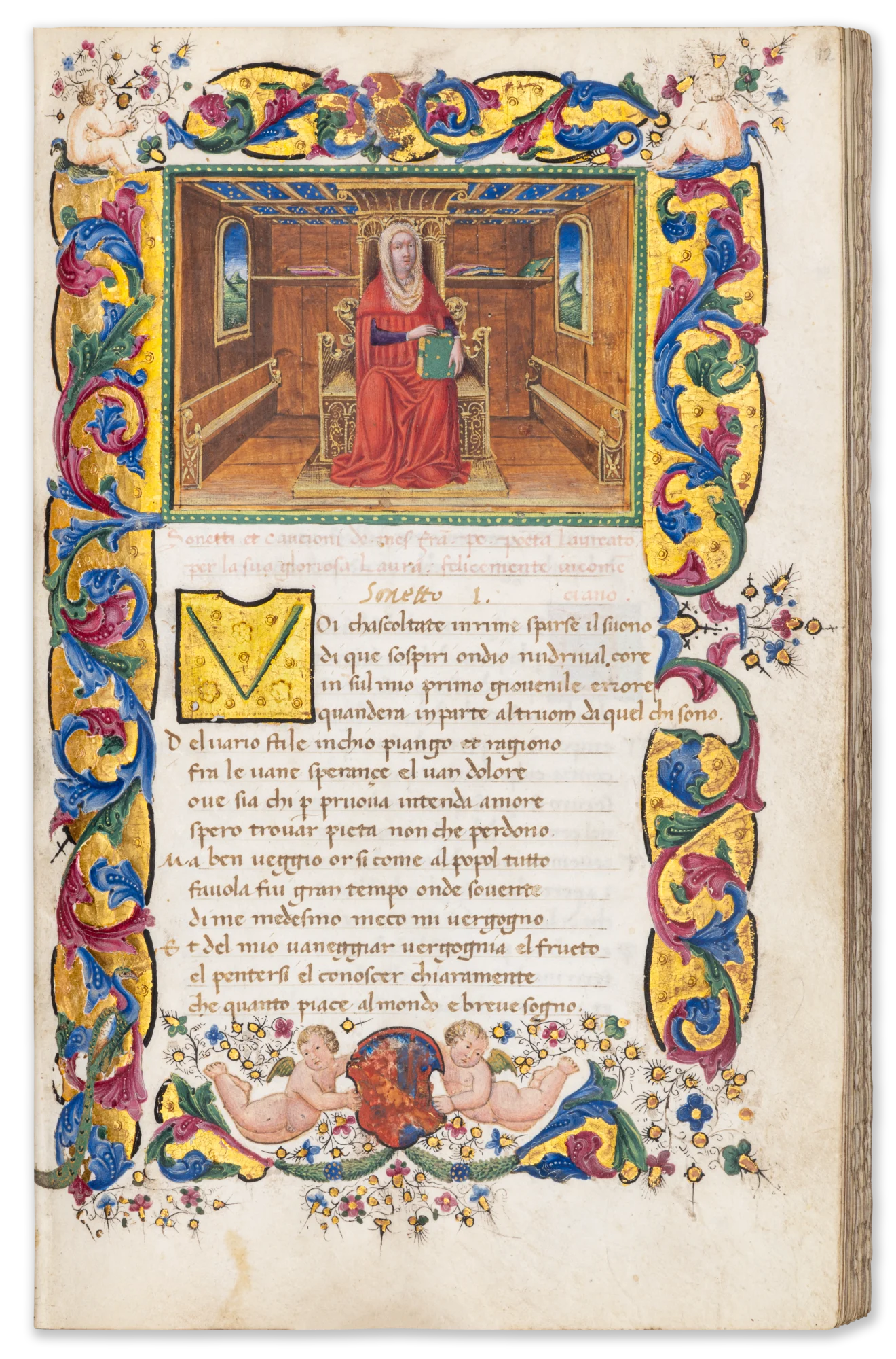 196 leaves. Three large miniatures within full illuminated borders of scrolling acanthus, flowers and bezants, the first of these with putti holding a coat of arms, c. 407 large illuminated initials on blue, red and green grounds with white filigree infilling, four large initials in pink or green on grounds of burnished gold, the initial on f. 158 opening the Trionfi with a partial floral border, smaller initials alternately in red or blue, rubrics in red. Complete. 17th-century brown morocco binding, tooled in gold and blind, gauffered edges. Overall in excellent condition.