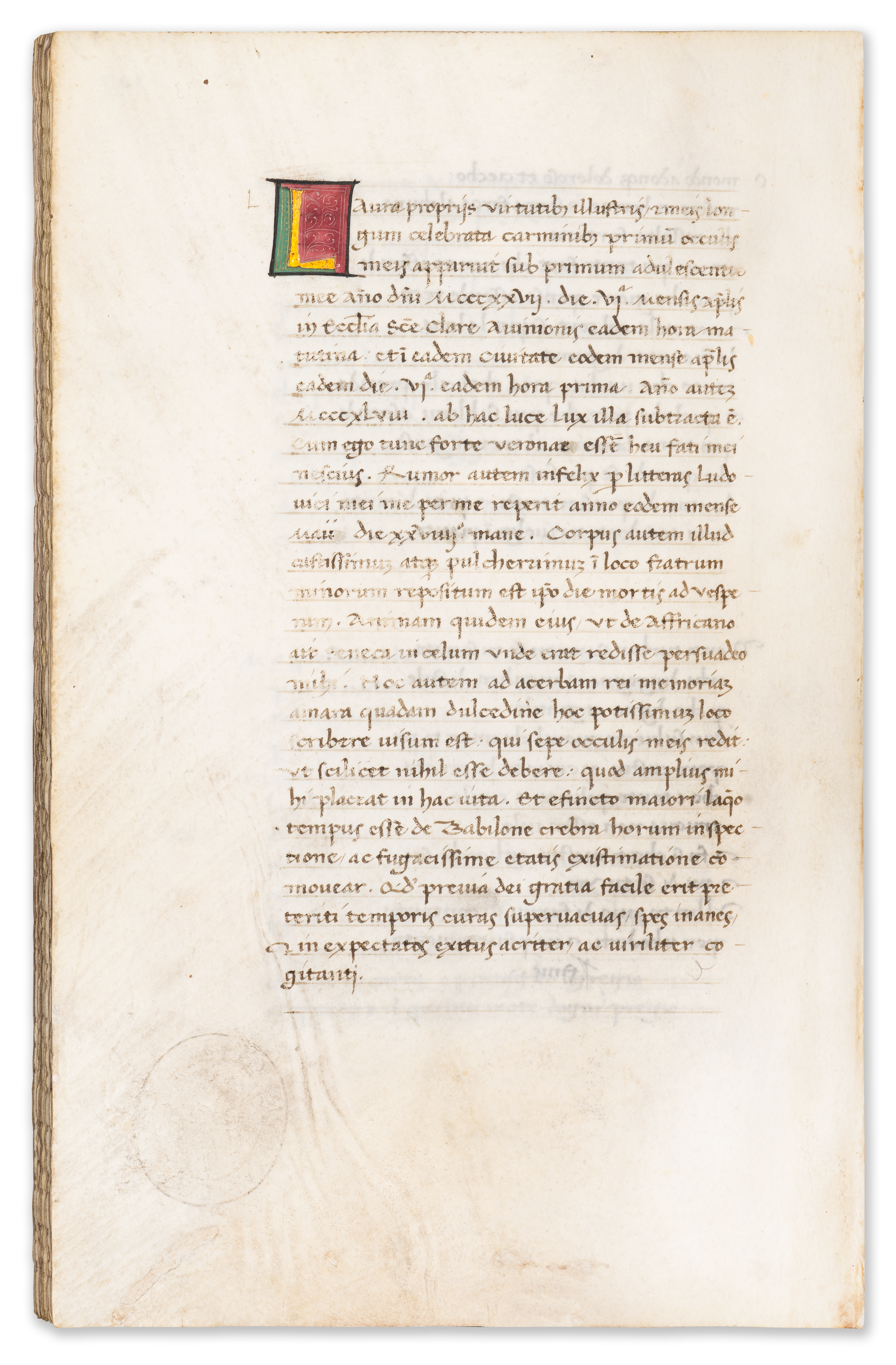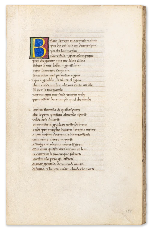 Distinguished by its refined illumination and elegant humanist script, it offers a rare and highly contemporary witness to the reception of Petrarch’s poetry in mid-fifteenth-century Tuscany. Newly identified as a previously unknown member of the Forma Chigi textual family—descended from Boccaccio’s autograph copy—the manuscript shows especially close affinities with two Florentine exemplars, and its mise en page corresponds exactly to that of another codex unmistakably penned by Gentilis himself. The poems are arranged in a non-canonical sequence, shedding light on early modes of textual organization and personal engagement with the Fragmenta .