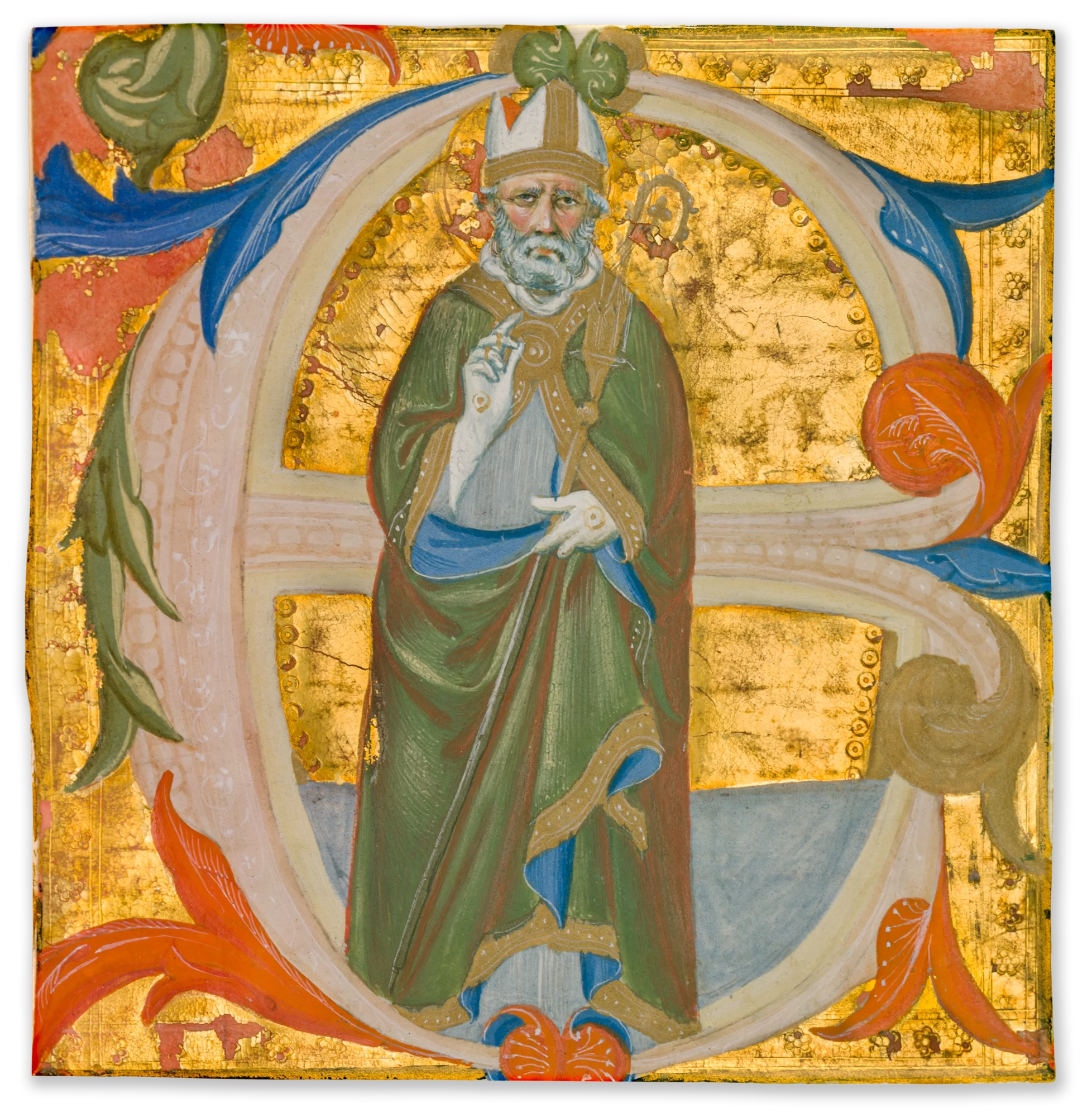 In front of the old rose-pink initial ‘E’ surrounded by multicolored foliage decoration, the figure of a Holy Bishop with miter, crozier, gloves and rings, is depicted while blessing with his right hand. He faces the viewer with an intense, almost absorbing, gaze. He wears, over a silver blue-gray undergarment, a blue-trimmed green coat. The skillfully articulated draperies fold into warm burgundy shadows, giving the garment a shimmering effect. The luminous habit of the figure stands out from a richly tooled gold field.