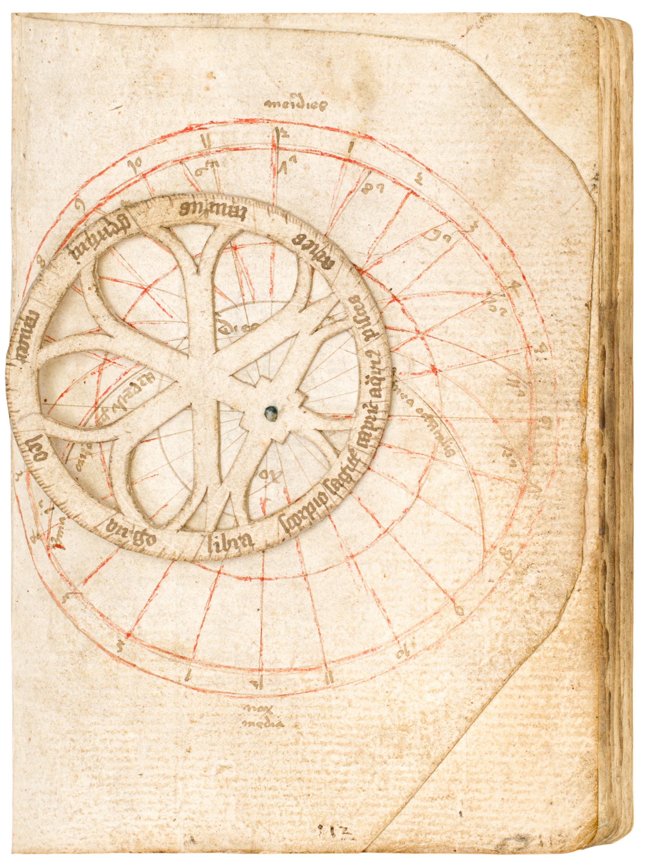 f. 112r Astrological texts with a model astrolabe with movable volvelle attached to the centre.