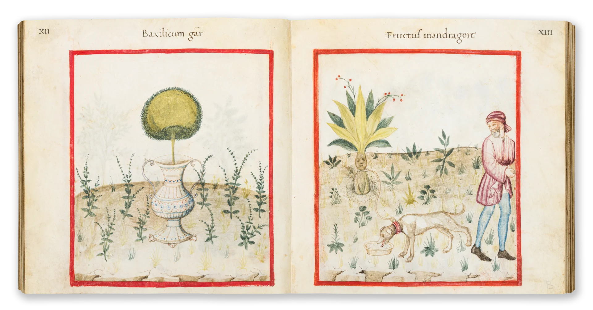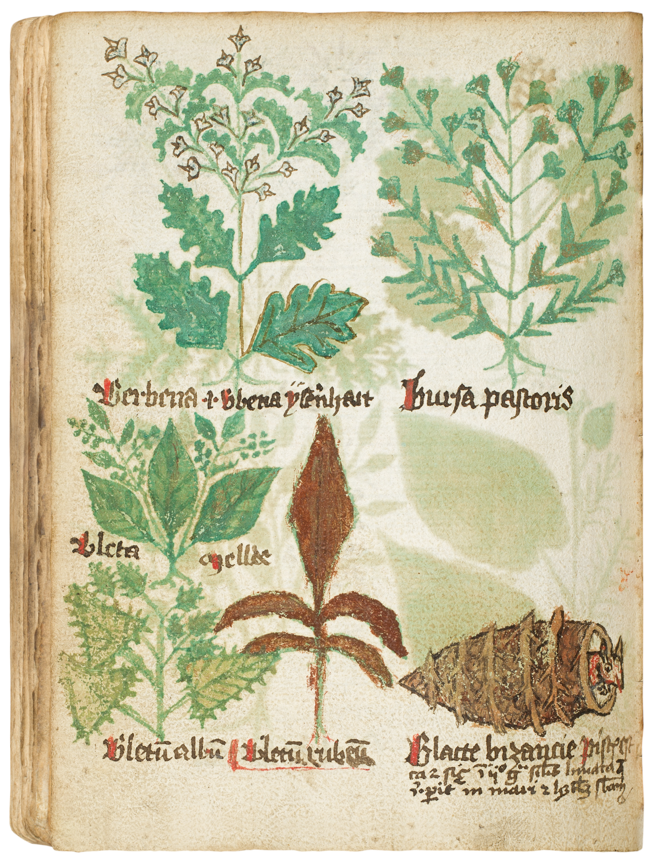 Unlike purely botanical reference works, the Tractatus therefore was primarily medical in purpose. Images are paired with names and recipes. Properties, instructions, and lists of remedies are carefully recorded. The medicaments discussed are composed of a single constituent, the simplicia — mostly plant-based. This pharmacopeia was intended for physicians, apothecaries, masters and professors of medicine, and their students. By the late fourteenth century such manuscripts were commissioned in Lombardy and subsequently circulated to France, England, and other regions north of the Alps. Their realistic plant depictions attracted not only medical professionals but also noble patrons and wealthy bibliophiles, sometimes even without accompanying texts. Among the finest examples is the late fourteenth-century Carrara Herbal, made at considerable expense for the Duke of Padua (British Library, Egerton MS 2020).