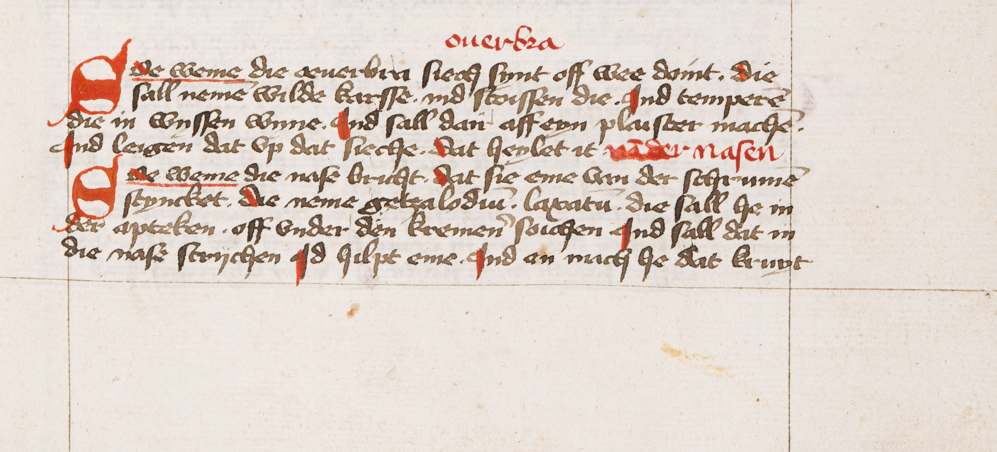 Soe weme die ouvebra siech synt off wee doint die soll nemen wilde barsse ind stoissen die ind tempere in wyssen wyne. Ind sall dan aff eyn plaster machen ind leigen dat opd dat sieche. Dat heylet it.